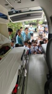 “Dokter-dokter, kenapa ruangannya tidak ada sekatnya?” tanya seorang anak polos, mungkin melihat tata letak kursi dan alat di dalam ambulans atau ruang edukasi. Dokter Siti dengan sabar dan senyum menjelaskan bahwa semua pengaturan ruangan dan peralatan dirancang untuk membantu dokter dan perawat agar bisa bekerja cepat dan mudah menjangkau pasien. Kegiatan edukasi dan pengenalan profesi ini diharapkan dapat menghilangkan rasa takut anak-anak terhadap dokter dan rumah sakit, serta menumbuhkan minat mereka terhadap dunia kesehatan.