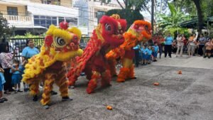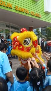 Kejutan paling dinantikan adalah kehadiran tiga barongsai yang tampil memukau. Tidak hanya satu, melainkan tiga barongsai hadir sekaligus untuk menghibur seluruh warga sekolah. Atraksi mereka yang lincah, enerjik, dan penuh warna disambut riuh tawa serta wajah-wajah ceria anak-anak TK Katolik Santa Clara. Sorak sorai terdengar setiap kali barongsai melompat dan bergerak mendekati para siswa.